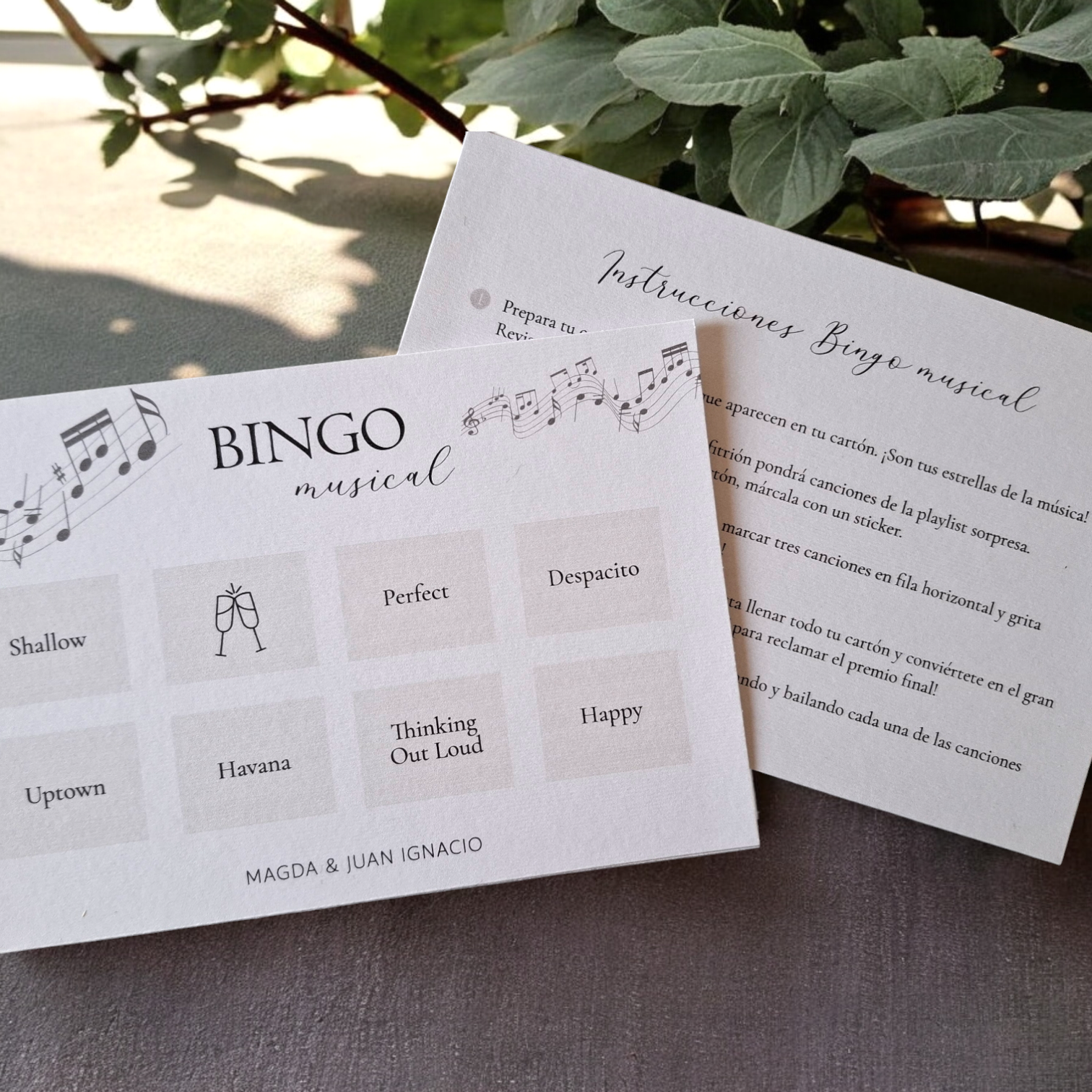 - Bingo musical para bodas. ¡Sorprende a tus invitados con el juego del momento en el 2025! Dale un toque divertido a tu boda con este juego que dará inicio al baile y entretendrá a todos. ¡No pierdas la oportunidad de crear recuerdos inolvidables con Bingo musical!