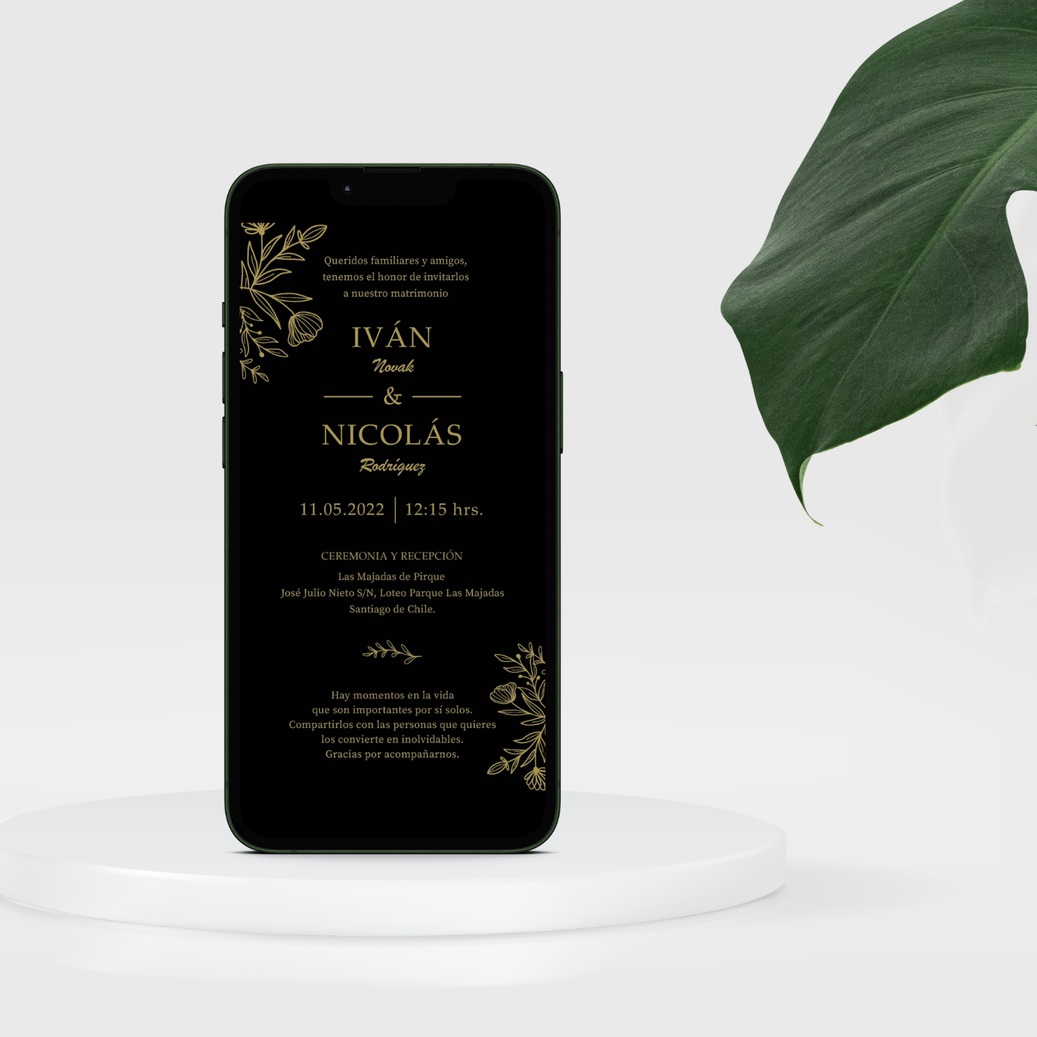 Pack de invitación de boda en formato digital y físico. Ahorre tiempo y costo al enviar su invitación de forma digital, y a la vez una invitación física de alta calidad para entregar a los familiares o amigos que prefieren lo tradicional. ¡La forma perfecta de combinar lo moderno con lo clásico!