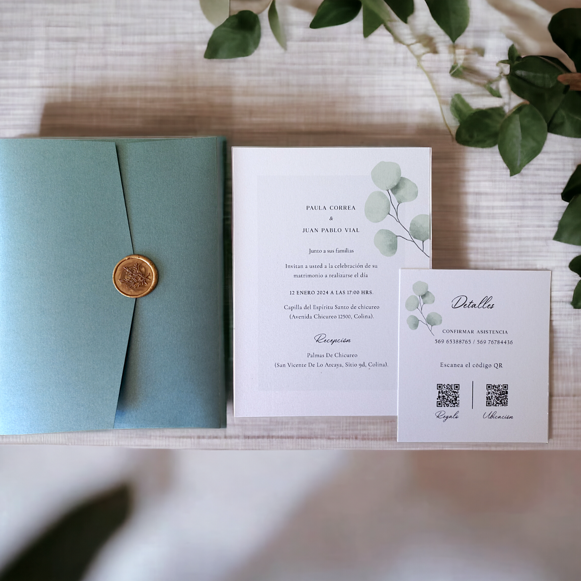 Incluye nombre de invitados (se imprime el nombre en una tarjetita que se pega al reverso del sobre).