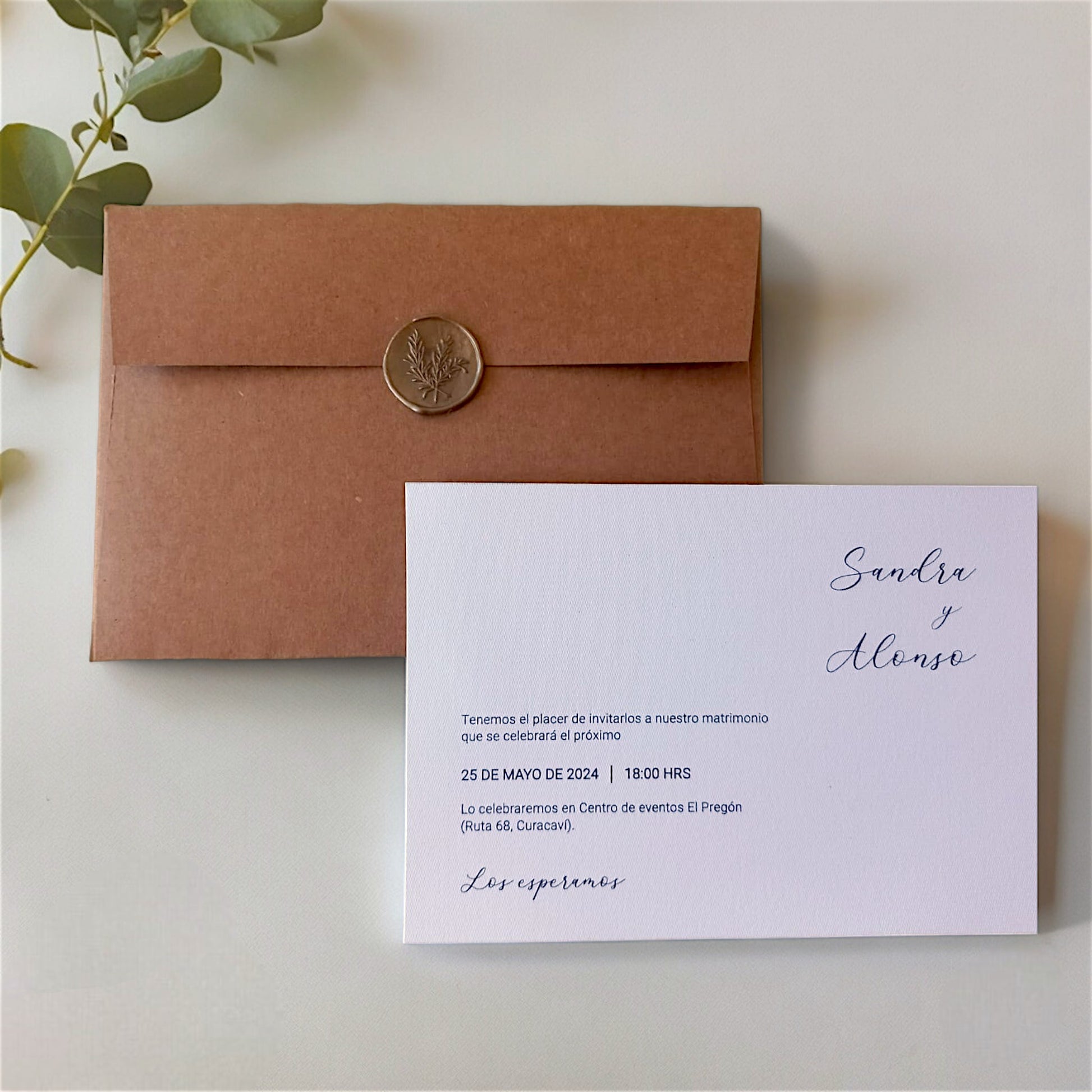 Añade un toque elegante y rustico a tus invitaciones con nuestro diseño MARRONE (cód.401). Hechas en papel blanco texturado y acompañadas de un sobre kraft con un sello de lacre dorado, nuestra invitación ofrece un estilo simple y sofisticado. ¡Impresiona a tus invitados con este detalle único!