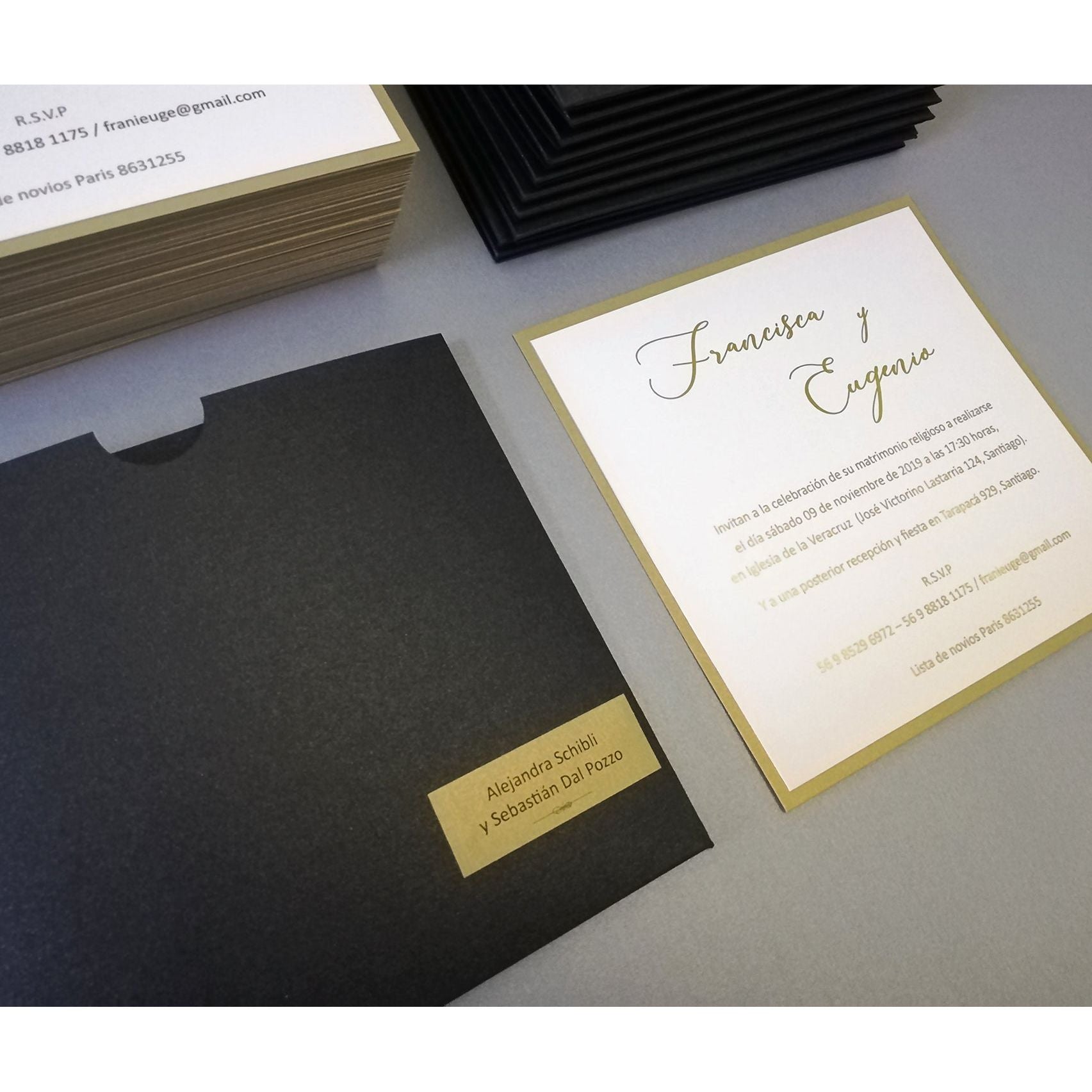 • Tarjeta texto en papel liso mate blanco con aplicación de folia oro.