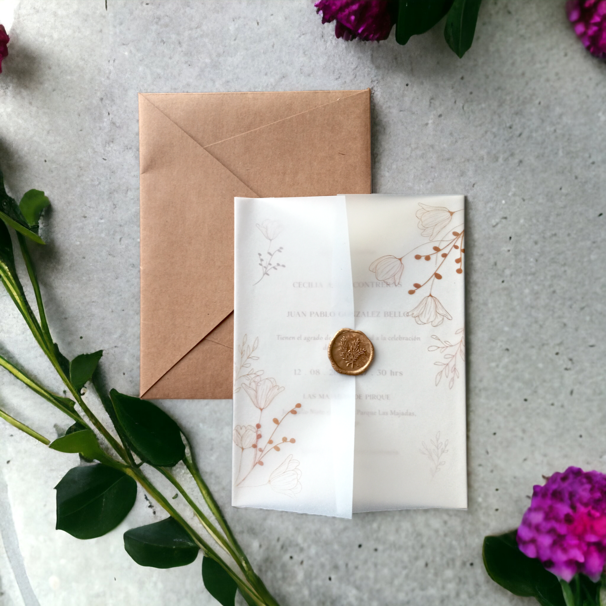 Invitación con una combinación perfecta de delicadeza, romanticismo y sobriedas para la temporada de matrimonios. Con tarjeta de texto principal cubuerta en papel vellum con sello de cera dorado. Cada detalle ha sido cuidadosamente seleccionado para reflejar la personalidad de la pareja y brindar a los invitados una experiencia inolvidable desde el primer momento.