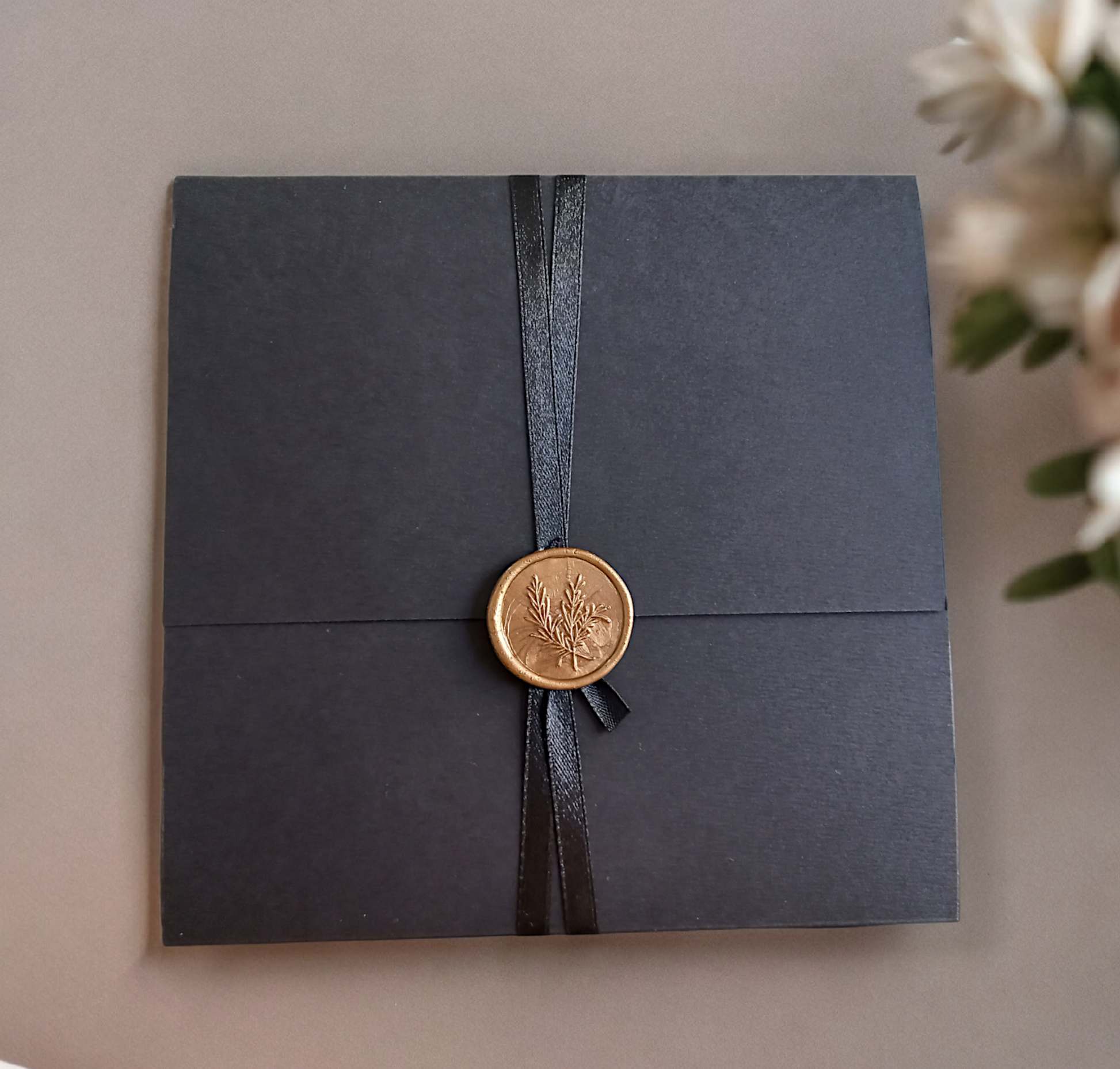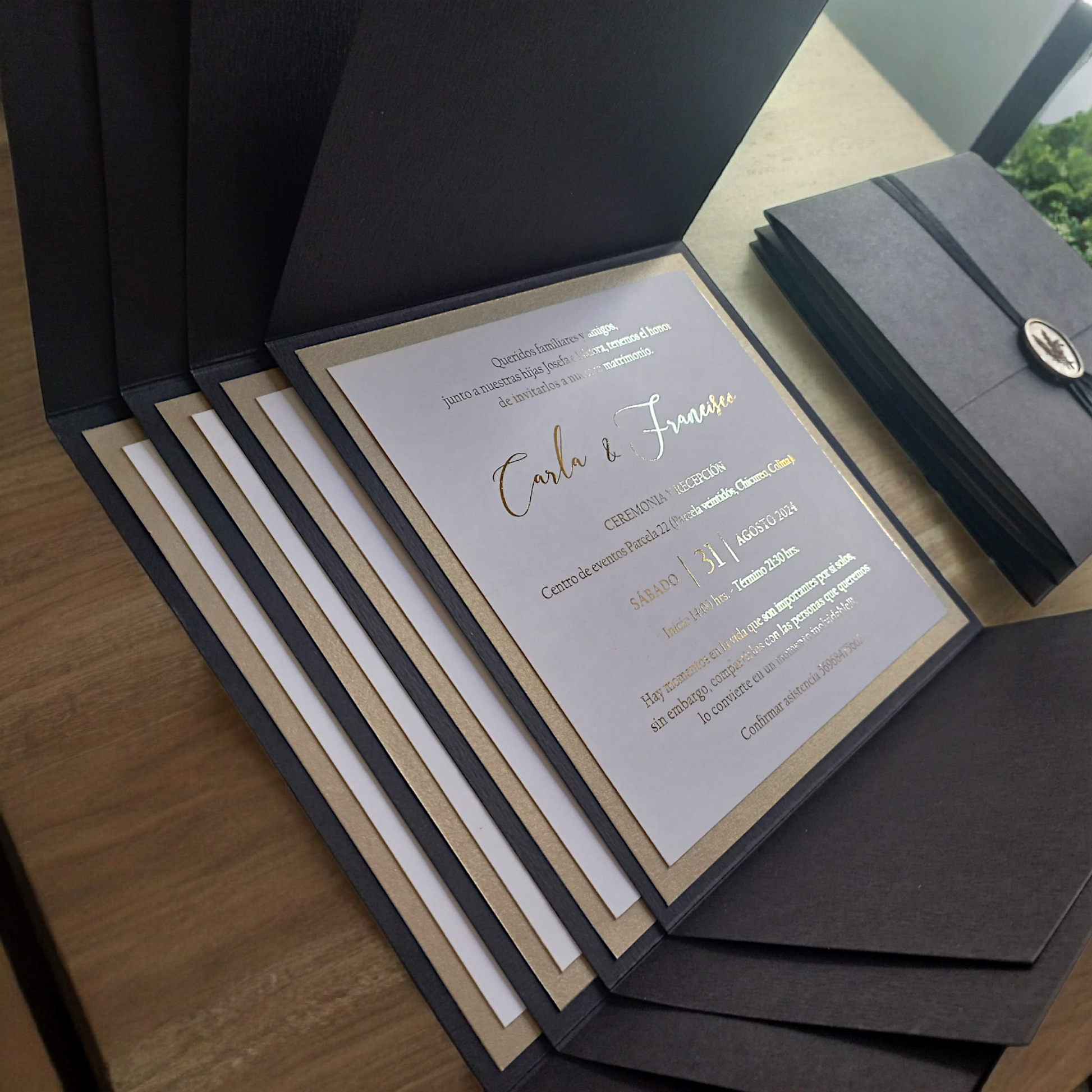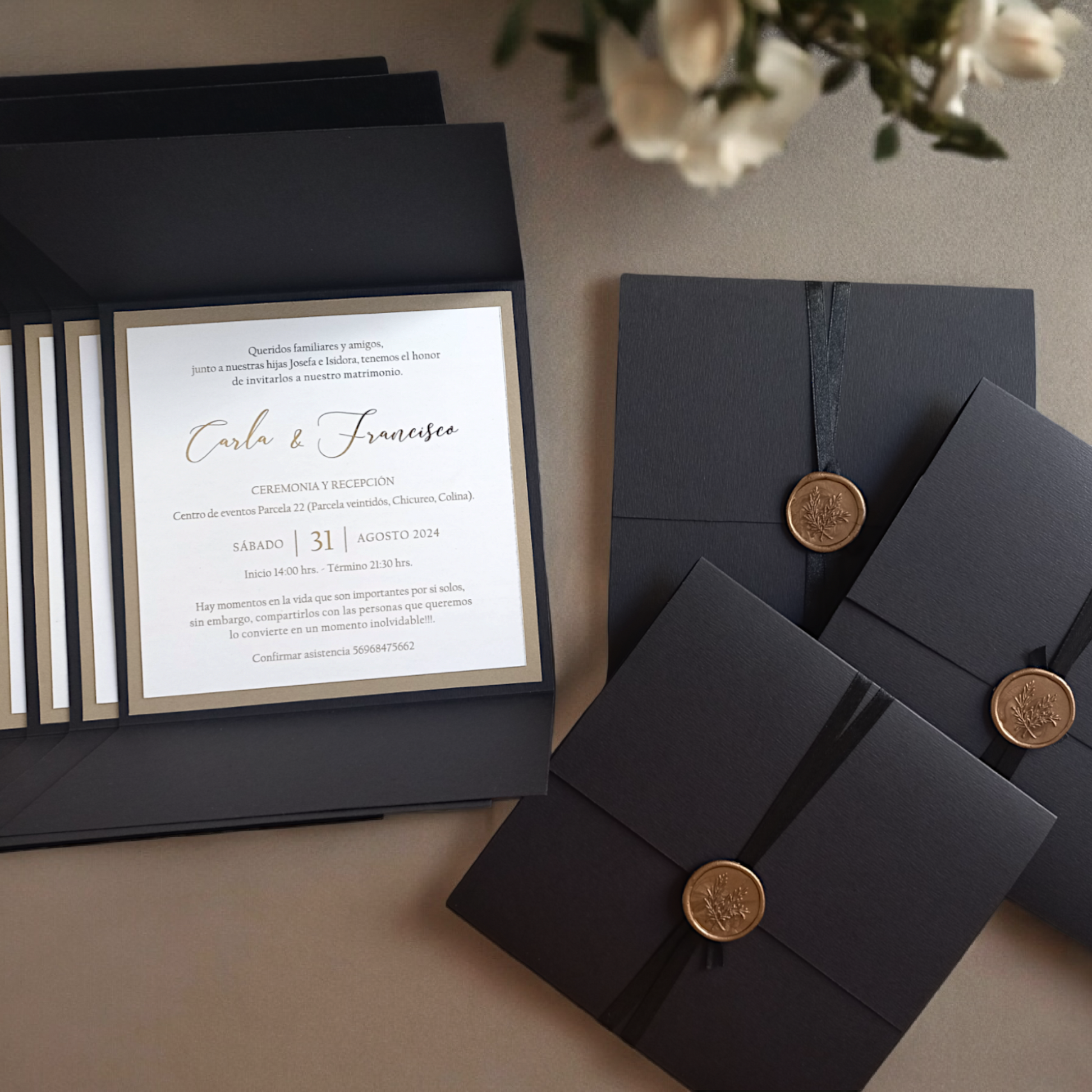 ¡Invita con elegancia y estilo con nuestro diseño Castaño! Esta hermosa invitación en sobre tipo triptico cuenta con un sello de lacre dorado y texto en folia dorada, agregando un toque único y lujoso. El papel blanco en el interior brinda un contraste perfecto para resaltar tu mensaje. ¡Haz que tu evento sea inolvidable con esta invitación!