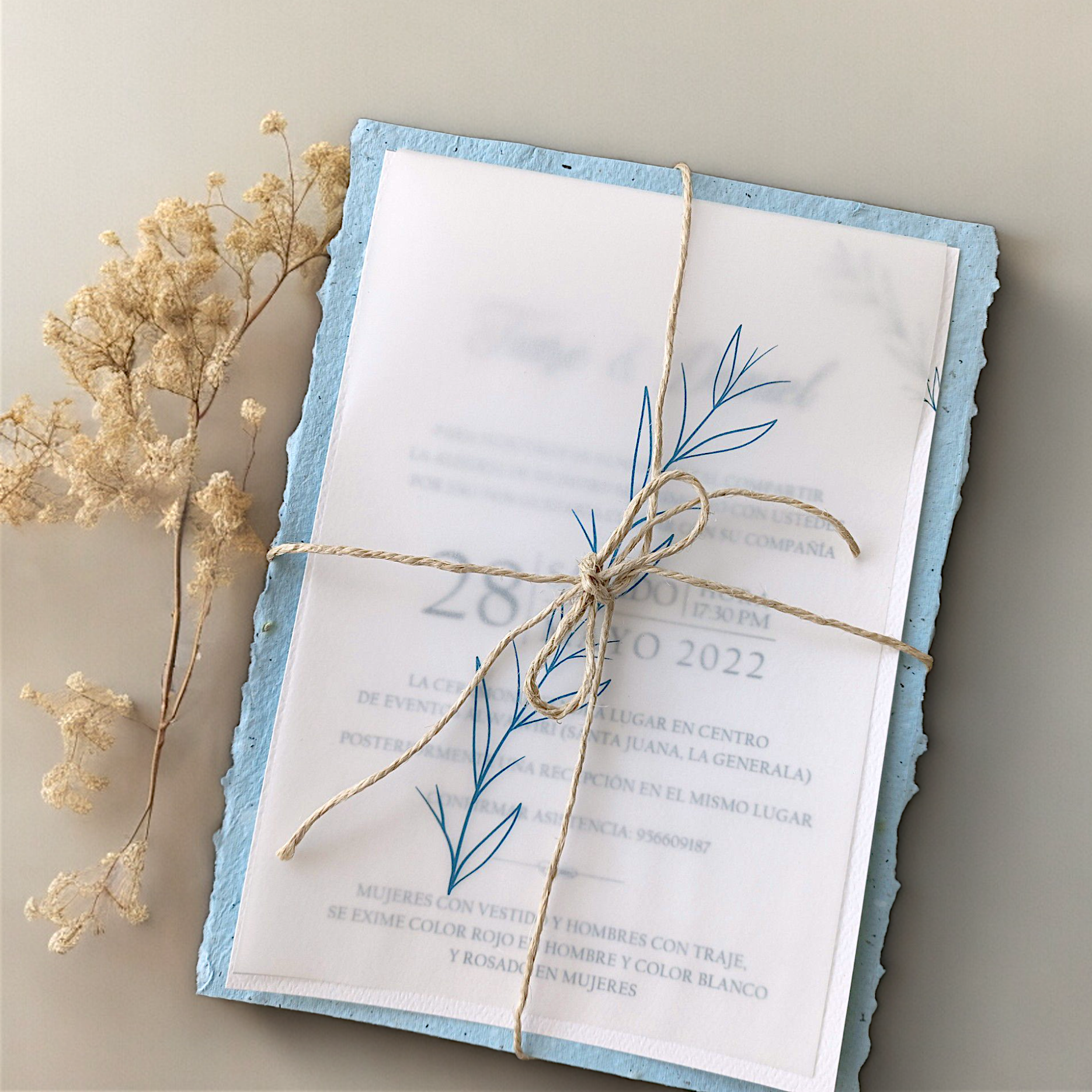 Tarjeta de fondo: Papel reciclado artesanal con semillas color celeste.