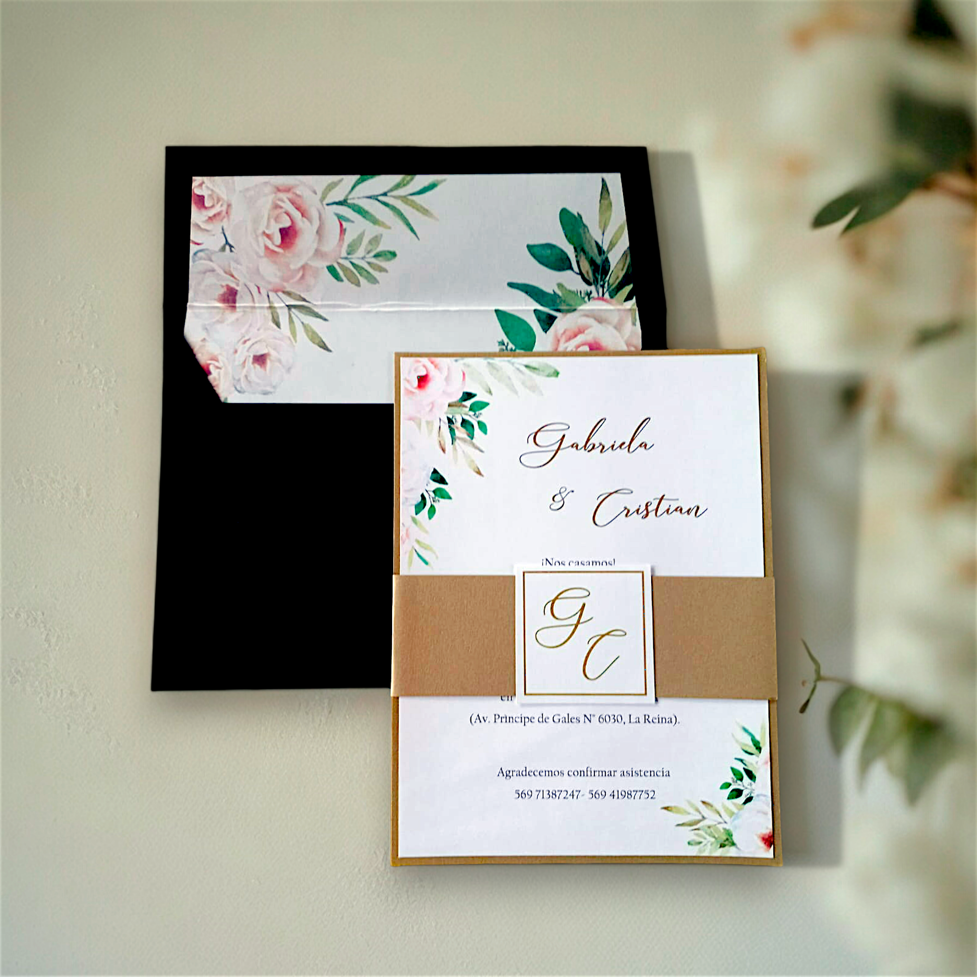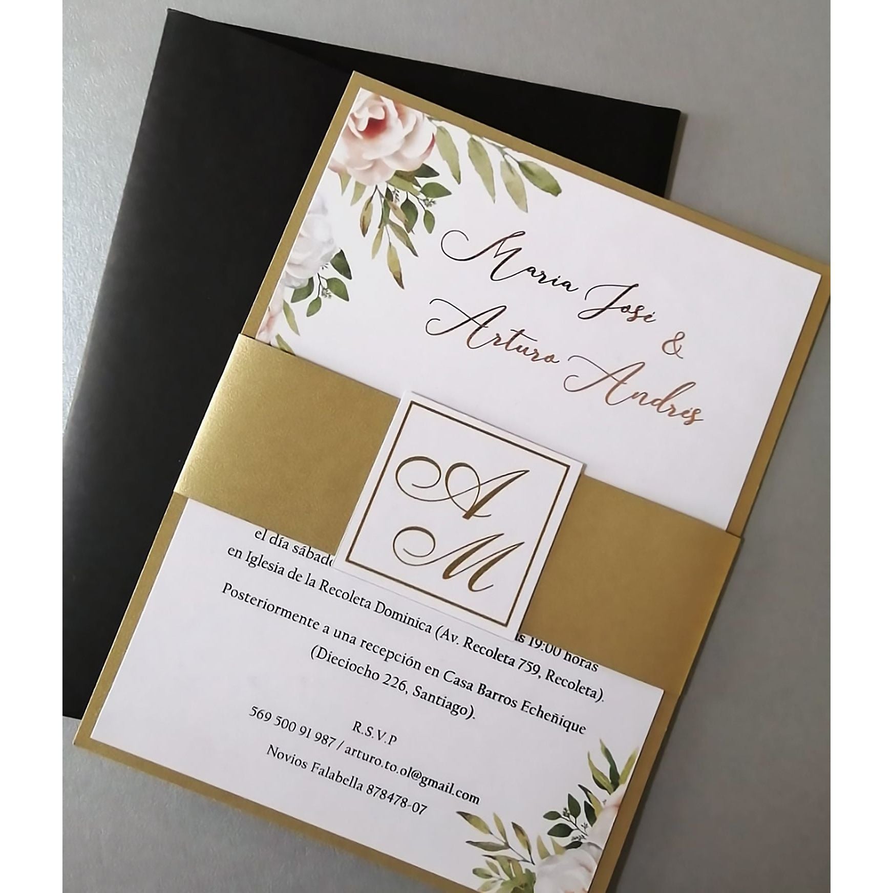 • Texto principal con folia dorada en nombre de novios