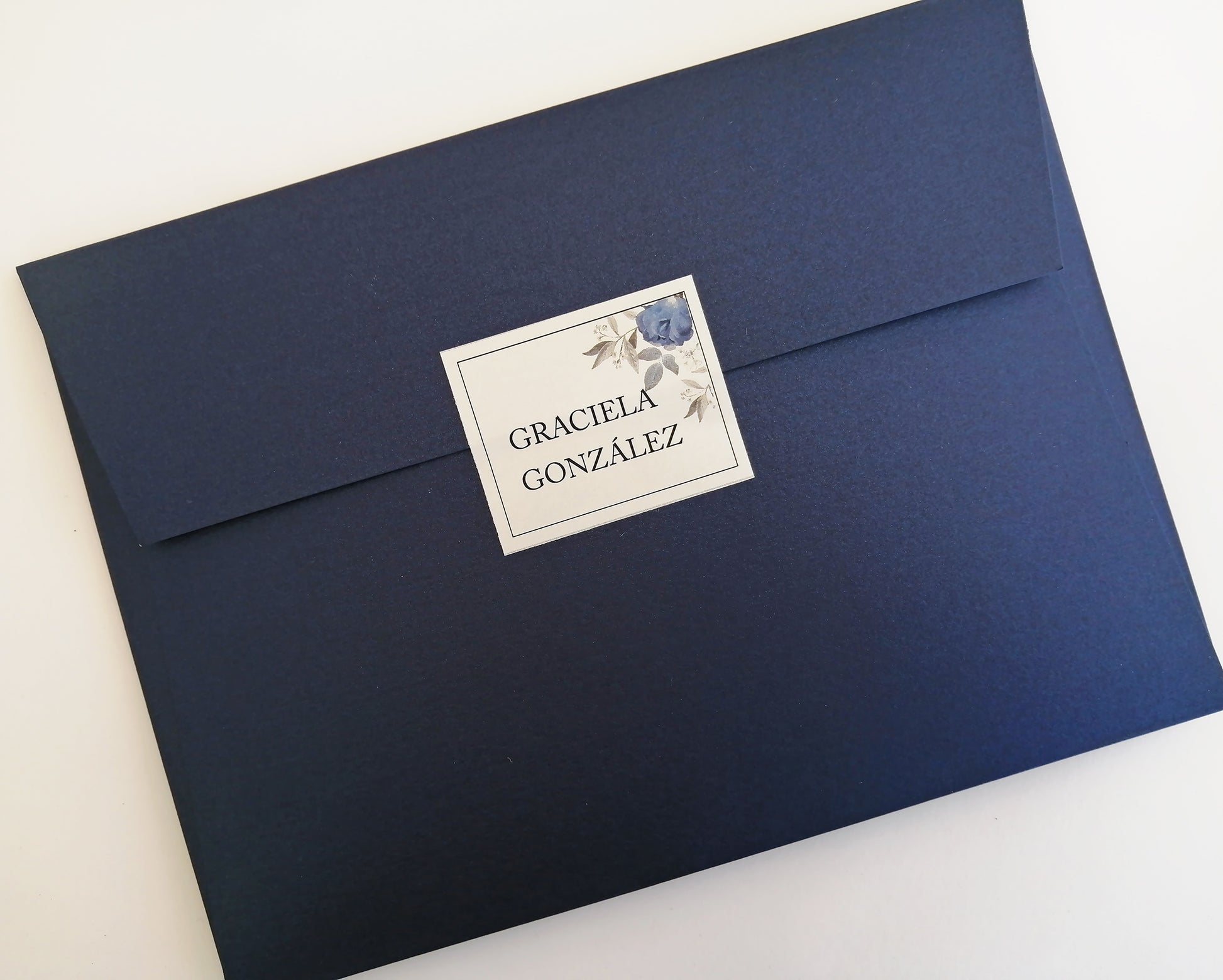 Cierre de sobre con etiqueta adhesiva con nombre de invitados o nombre de novios